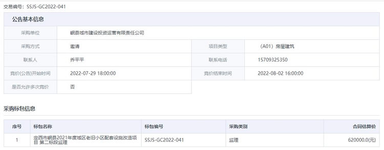 定西市岷县2021年度城区老旧小区配套设施改造项目 第二标段监理招标公告