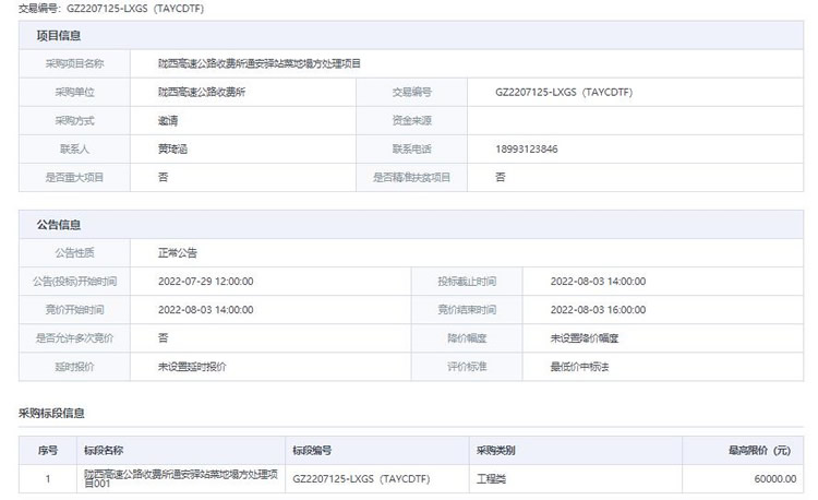 甘肃省招标中心有限公司受陇西高速公路收费所委托,根据《甘肃省人民政府办公厅转发省发展和改革委员会省公共资源交易局关于进一步加强和规范市县公共资源交易工作意见的通知》(甘政办发〔2018〕6号)、《政府集中采购目录和采购限额标准》等文件要求,对“陇西高速公路收费所通安驿站菜地塌方处理项目”以邀请竞价的方式进行采购,现将相关事宜公告如下: